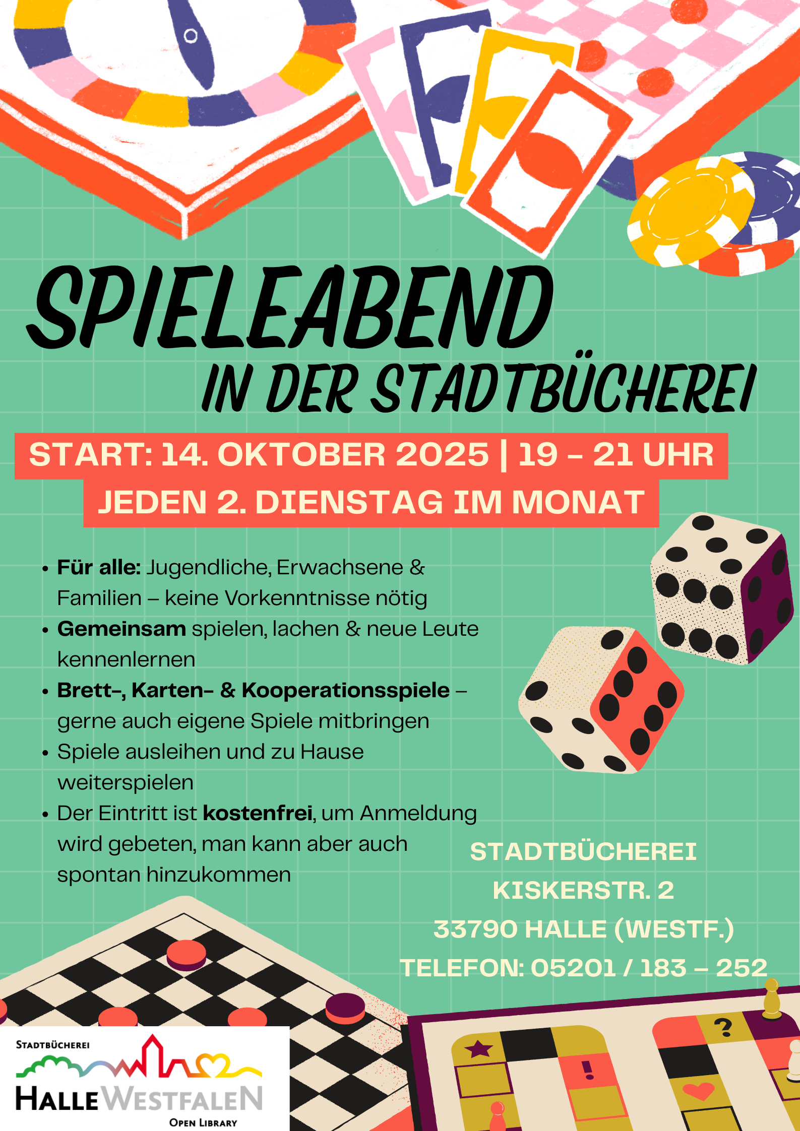 Am Dienstag, den 14. Oktober 2025, lädt die Stadtbücherei Halle Westfalen von 19 bis 21 Uhr herzlich zu einem Spieleabend ein.