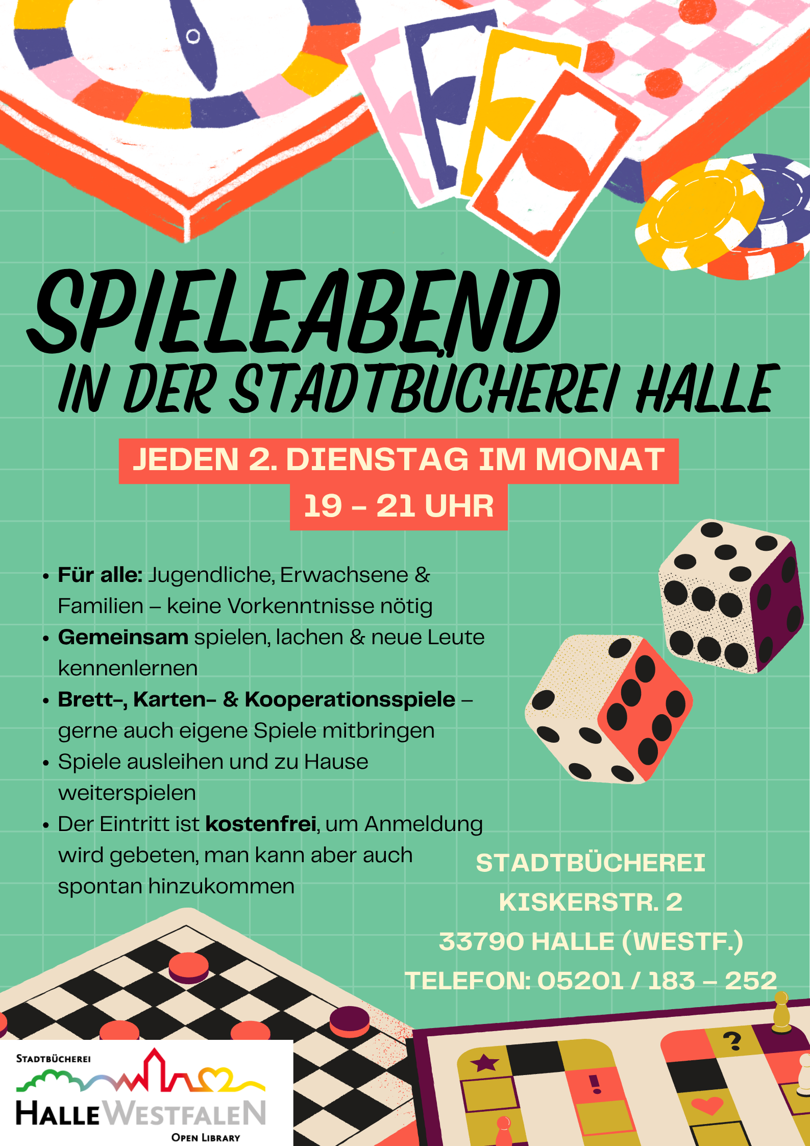 Am Dienstag, den 11. November 2025, lädt die Stadtbücherei Halle Westfalen von 19 bis 21 Uhr herzlich zu einem Spieleabend ein.